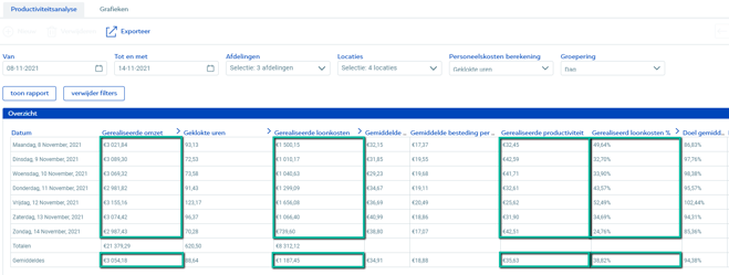 If you use From and To to select a period of one week and set the grouping to Day, the data is displayed by day. At the bottom, there is the Averages row, which shows the averages of the amounts/quantities above. In this case, the average productivity of that week is also worked out by calculating the average of the above amounts (productivity per day in that week). This is different from dividing the total turnover of that week by the total number of hours worked for that week.