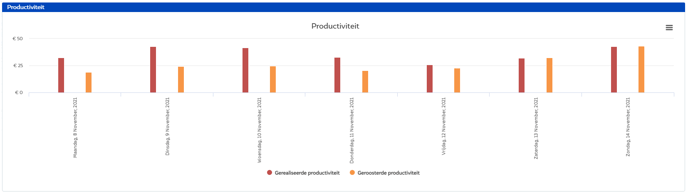 - Productivity: Shows the productivity actually achieved compared with the rostered productivity. The actual productivity is calculated using the turnover saved in the Logbook and the clocked hours. The rostered productivity is calculated using the completed sales forecast and the rostered hours.