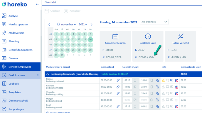 If you choose clocked hours, the hours actually clocked are multiplied by the hourly wage. This also applies to employees with a fixed contract. On a day when someone with a fixed contract does not work, Horeko does not factor in any costs.