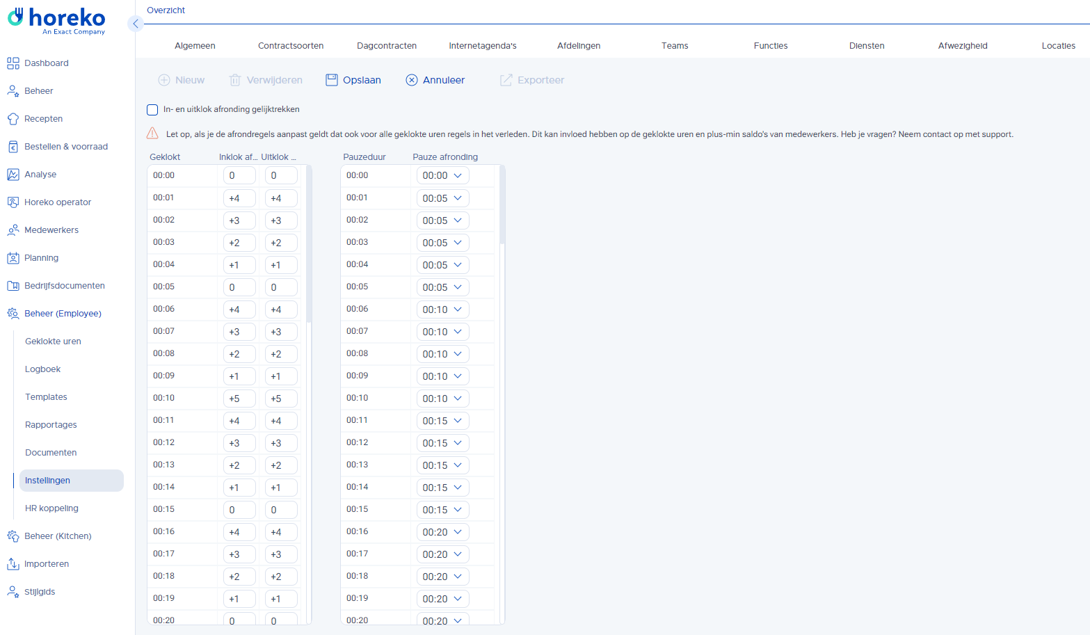 Let op, als je al met Horeko werkt en gaandeweg de afrondregels aanpast, houdt er dan rekening mee dat de geklokte uren met terugwerkende kracht aangepast worden. Dit kan dus ook invloed hebben op de plus-min saldo's van medewerkers. Wil je hier hulp bij? Neem contact op met support (login in Horeko en ga naar het supportportaal of bel naar +31 (0) 88-7119711).