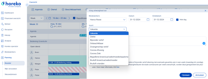 Als je als beheerder weet wanneer een medewerker afwezig is en dit het rooster naar voren wilt laten komen, kun je dat als volgt invoeren.