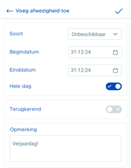 -App: Klik links bovenin op het menu icoontje -> Afwezigheid -> klik rechts bovenin op het plus teken (+) -> voer de juiste gegevens in -> klik rechts bovenin op het vink tekentje (✓).