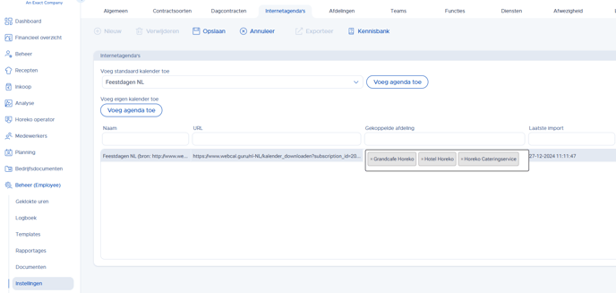 In het rooster is bovenin, tussen de data en de teams, de agenda te zien. Hierin kun je per dag agendapunten toevoegen, denk aan reserveringen van grote groepen, evenementen, etc. Je kunt ook internetagenda’s koppelen waardoor de agendapunten in die internetagenda automatisch in het rooster naar voren komen. Er staan een aantal internetagenda’s met feestdagen en schoolvakanties standaard in Horeko. Als je wilt dat deze in het rooster naar voren komen, kun je ze als volgt koppelen: Ga naar Beheer (Employee) -> Instellingen -> tabblad ‘Internetagenda’s’ -> selecteer, onder Voeg standaard kalender toe, een internetagenda -> dubbelklik op het lege veld in de kolom Gekoppelde afdeling om te selecteren in welke afdelingen de agenda in het rooster naar voren moet komen -> klik op voeg agenda toe -> klik op opslaan.