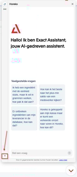 Als je inlogt in Horeko, zag je voorheen rechts onderin een blauw chat icoontje. Nu zie je hier het logo van de Exact Assistent, de Ai gedreven assistent die je helpt met jouw vragen over Horeko.