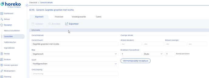 Dubbelklik op het zojuist gemaakte gerecht om deze te openen. Onder het kopje Informatie: Selecteer de juiste soort (ga naar Beheer (Kitchen) -> Soorten om soorten te beheren), dit is handig als je wilt filteren op soort in de lijstweergave van de gerechten en belangrijk voor analyses. Als alle gerechten aan de juiste soort gekoppeld zijn kun je bijvoorbeeld een analyse maken over de ‘hoofdgerechten’. Vul eventueel een omschrijving in -> vul bruikbare hoeveelheid in. Voor gerechten is dit meestal 1 stuks voor 1 persoon.