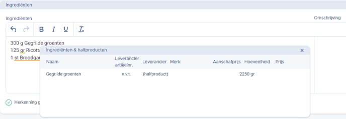 In een gerecht kun je zowel ingrediënten als halfproducten toevoegen. Dit kun je op twee manieren doen. Onder het kopje Ingrediënten: