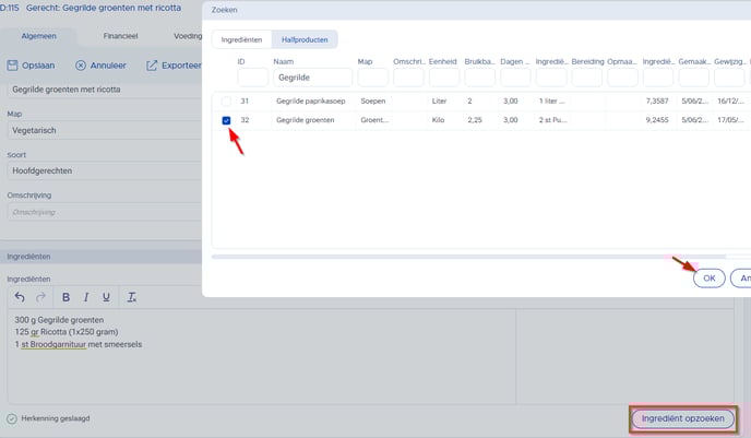 Klik op ingrediënt opzoeken -> zoek en selecteer (door het vinkje voor het item) één of meerdere ingrediënten en/of halfproducten -> klik op ok. De ingrediënten staan nu met de hoeveelheid 0 in het recept. Verander de 0 in de juiste hoeveelheid.