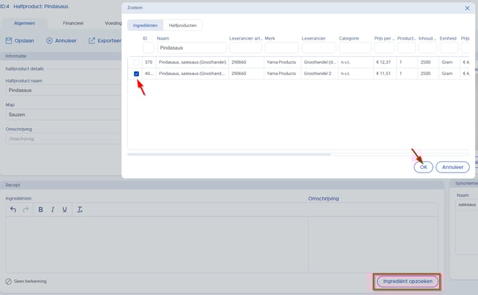 - Klik op ingrediënt opzoeken -> zoek en selecteer (door het vinkje voor het item) één of meerdere ingrediënten en/of halfproducten -> klik op ok. De ingrediënten staan nu met de hoeveelheid 0 in het recept. Verander de 0 in de juiste hoeveelheid.