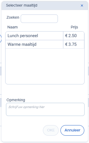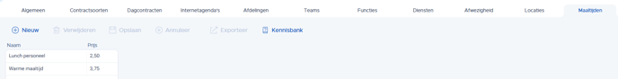 Om maaltijden toe te voegen: Ga naar Beheer (Employee) -> Instellingen -> tabblad 'Maaltijden'-> klik op + Nieuw om een maaltijd toe te voegen -> dubbelklik om de naam of prijs te wijzigen.