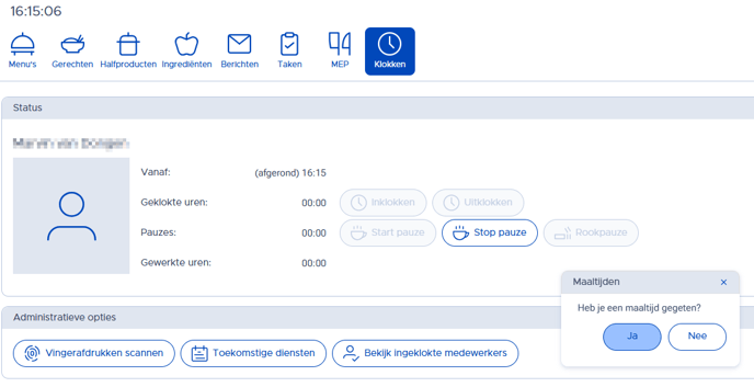 Als medewerkers hun pauze klokken, kunnen ze na het beëindigen van hun pauze aangeven of zij een maaltijd gehad hebben.