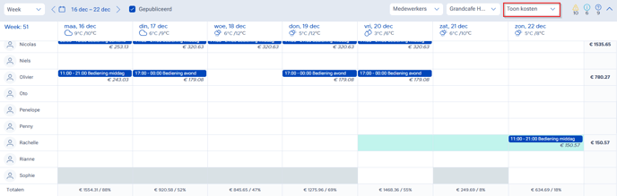 Zet de roosterweergave op Toon kosten door rechts bovenin op Geen totalen te klikken en Toon kosten te selecteren. Onder elk team zie je het verachte loonkosten percentage per dag per team. Helemaal onderin zie je het verwachte loonkostenpercentage van de hele afdeling per dag.