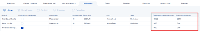 Om het doel voor de gemiddelde besteding per gast en de productiviteit in te stellen ga je naar Beheer (Employee) -> Instellingen -> tabblad Afdelingen.