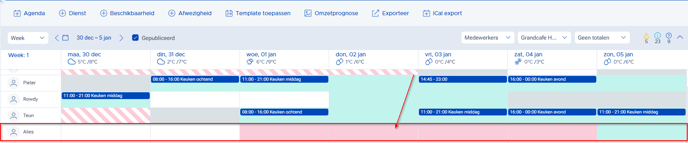 Als een medewerker gedeeltelijk beschikbaar is en gedeeltelijk afwezig, worden beide kleuren weergegeven: