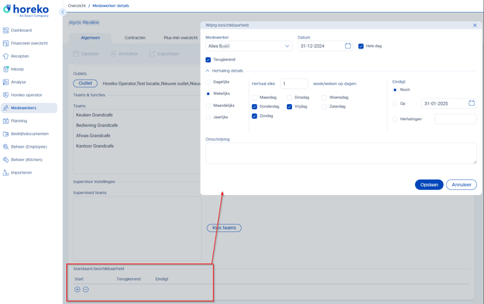 Voor standaard beschikbaarheid (ingevoerd onderin het het account van medewerkers) geldt: